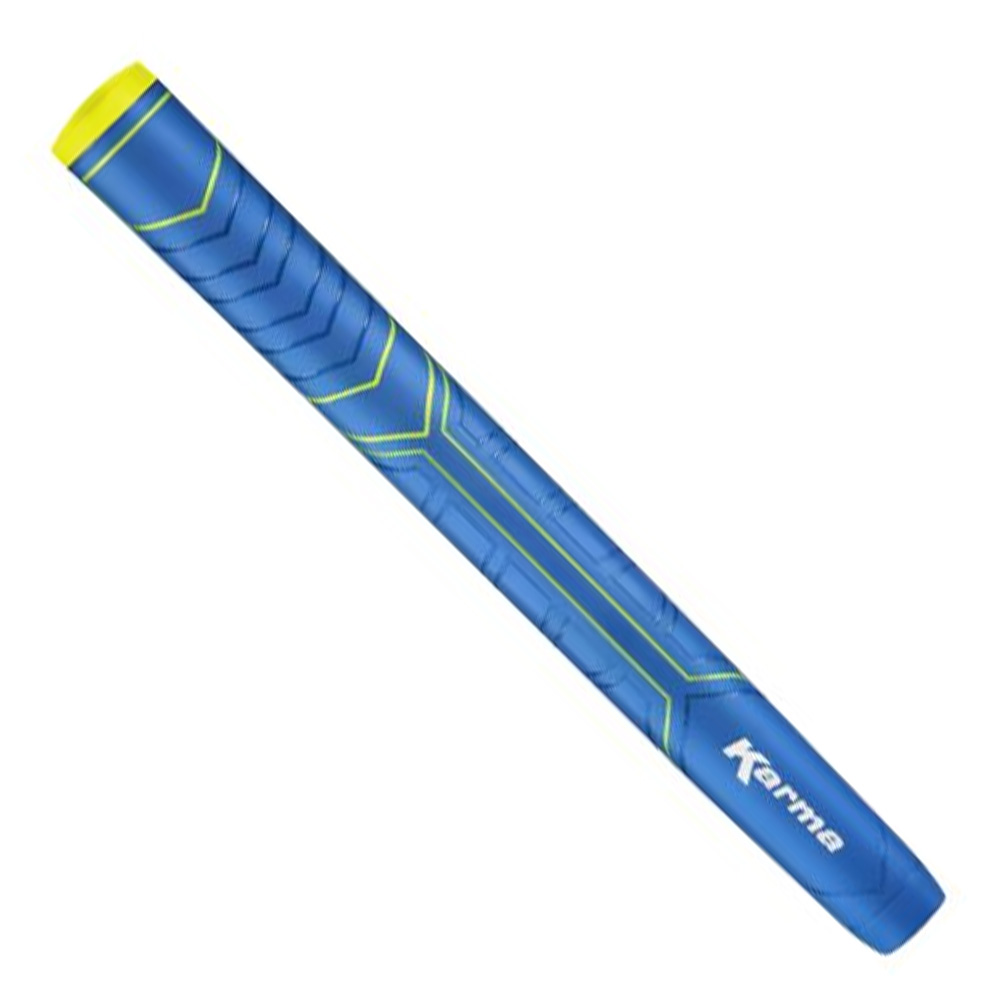 The Karma Big Softy Oversize Putter Grip has an ergonomic shape and subtle tapered profile to encourage light grip pressure a pendulum stroke. The ultra-soft, all-rubber compound and multi-textured design provides critical traction throughout the fingers and a heightened level of comfort for the palms and thumbs. Coupled with the contrasting alignment lines helps to keep the putter square to the target. Heavier weight is ideal for those who prefer a counter-balanced putter for added stability and distance control. Measures 1.1″ side-to-side x 1.25″ front-to-back